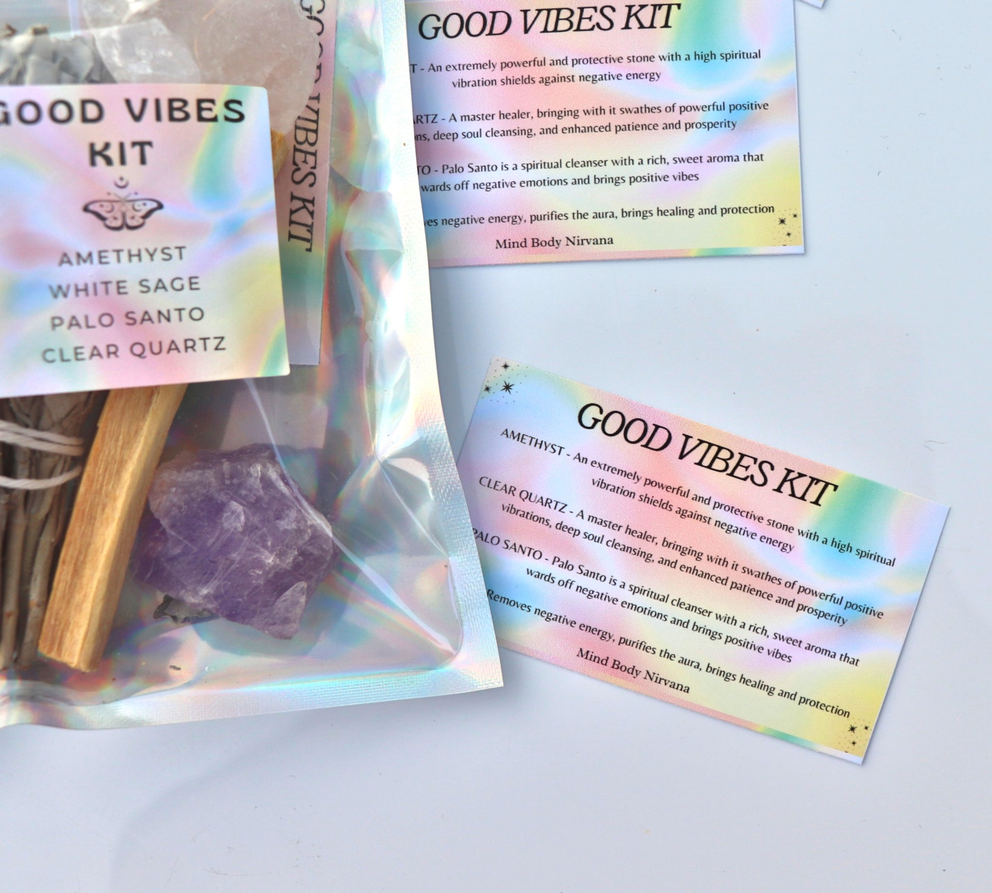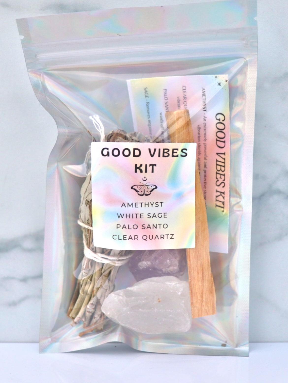 The Good Vibes Kit with Sage, Amethyst, Clear Quartz, and Palo Santo is a collection of items to promote positive energy, spiritual cleansing, and protection. Here's a breakdown of the items and their uses: