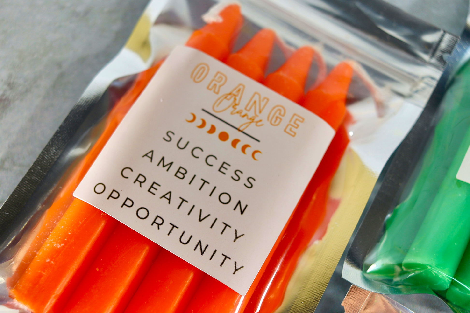 Orange Candle - intellect, networking, legal affairs, joy, stimulating energy, attraction, justice, celebration, success, ambition, creativity, opportunity